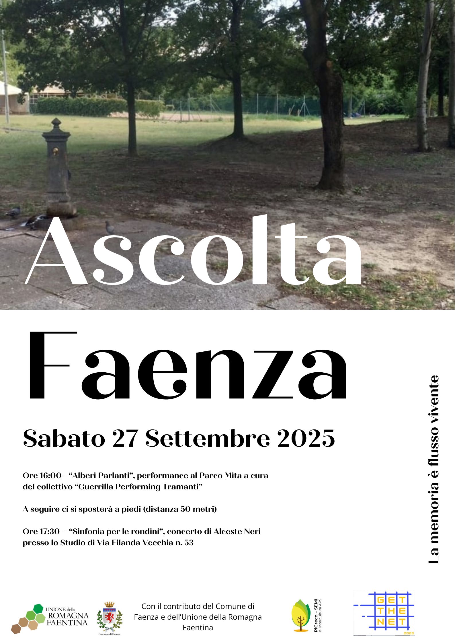 Scopri di piùPerformance site-specific e concerto con Alceste Neri Sabato 27 settembre 2025 Faenza ospita un evento che intreccia arte, memoria e musica. Il collettivo torinese Guerrilla Performing Tramanti presenta al Parco…